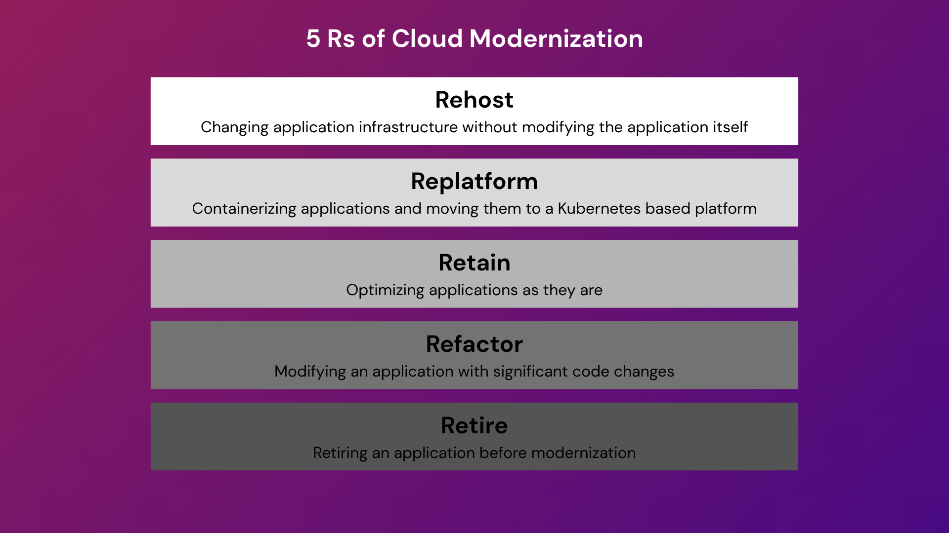 As previously mentioned, cloud modernization strategies will vary by company, though there are common trends to observe from successful modernization. Much like cloud migration, cloud modernization has 5 central strategies for a successful modernation. And much like cloud migration, these strategies also have a nice ring to it- The 5 Rs of Cloud Modernization: