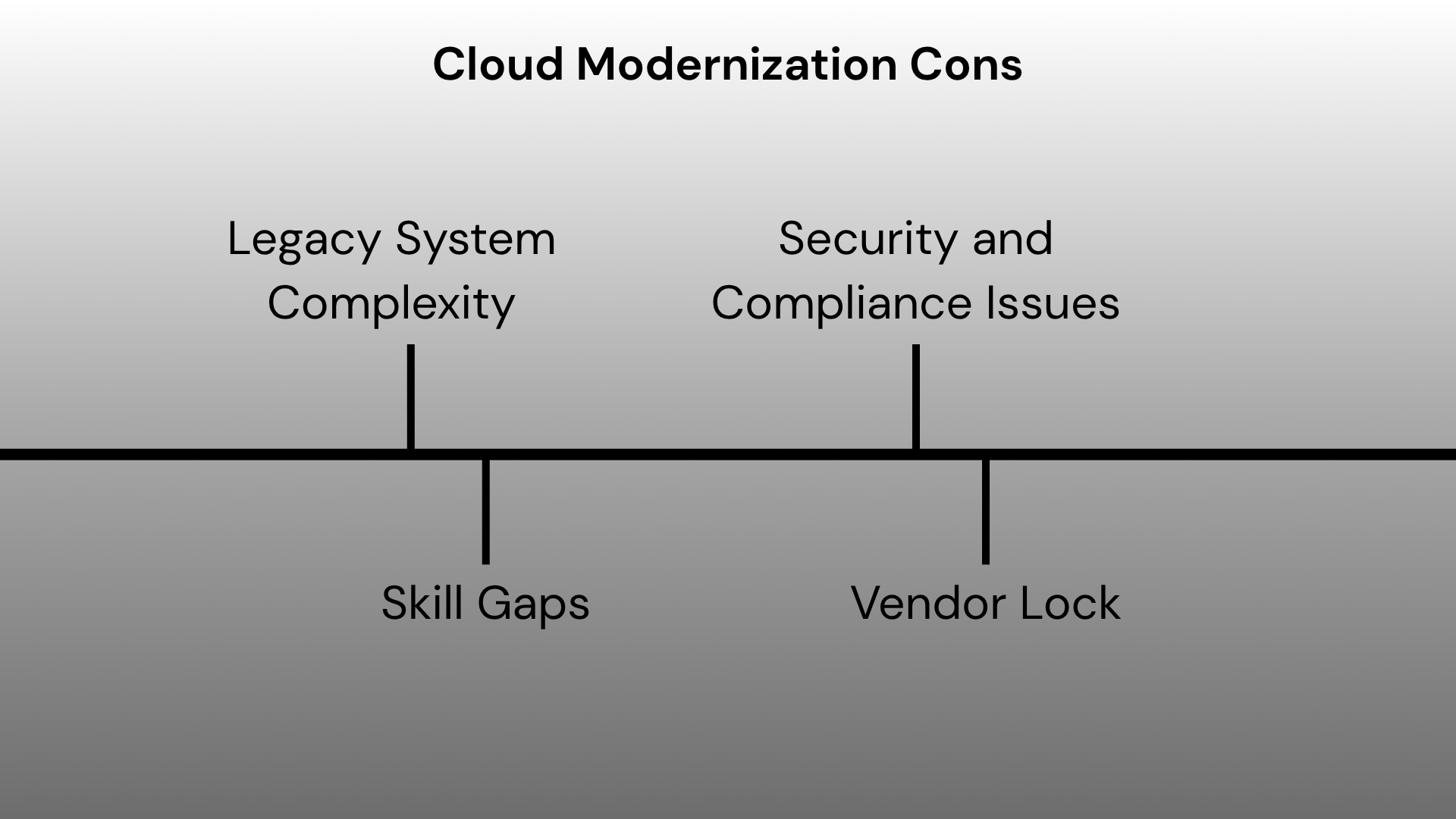 The challenges of cloud modernization, on the other hand, are not something to scoff at. Challenges within the cloud modernization process include: