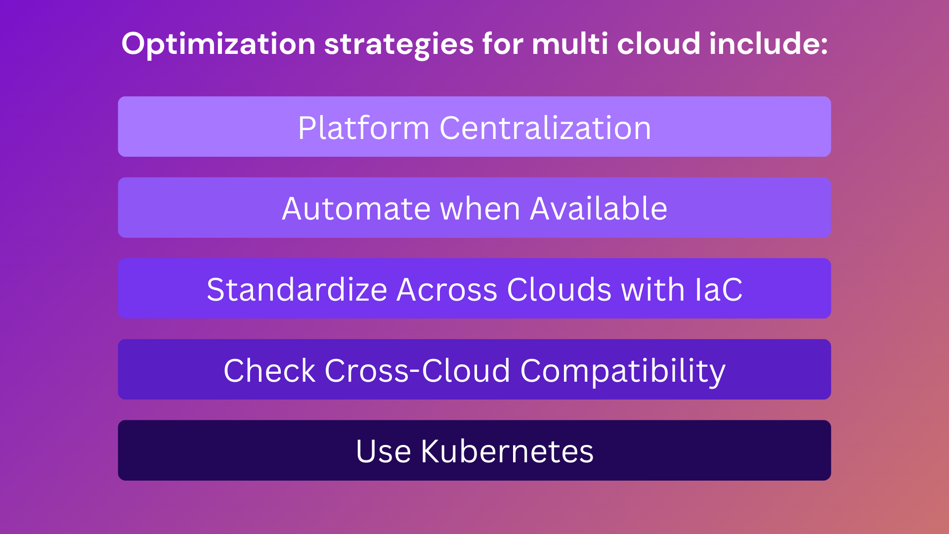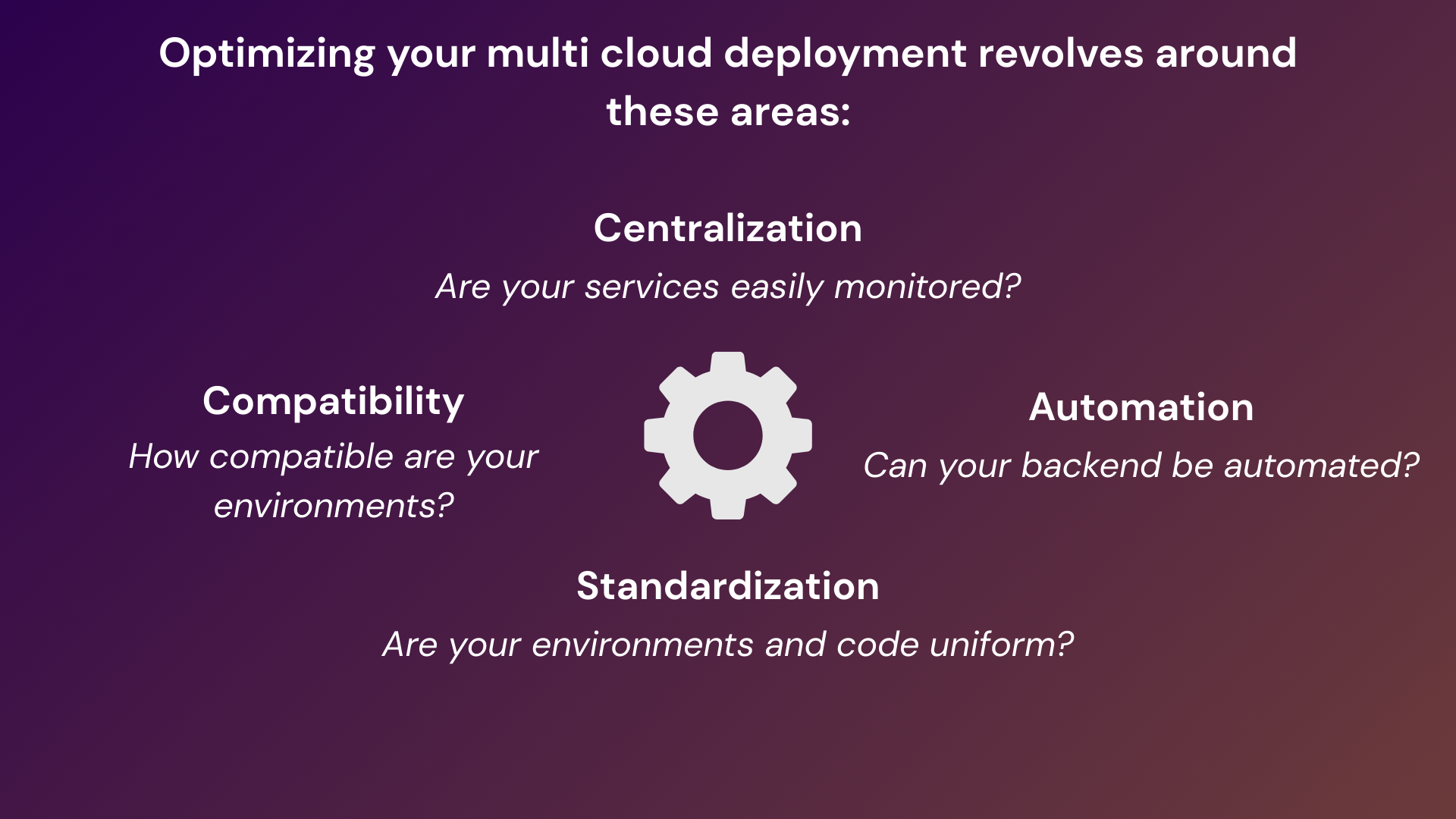 In order to optimize a multi cloud deployment while addressing many of the challenges this approach creates, teams should prioritize these central aspects in their system configuration: